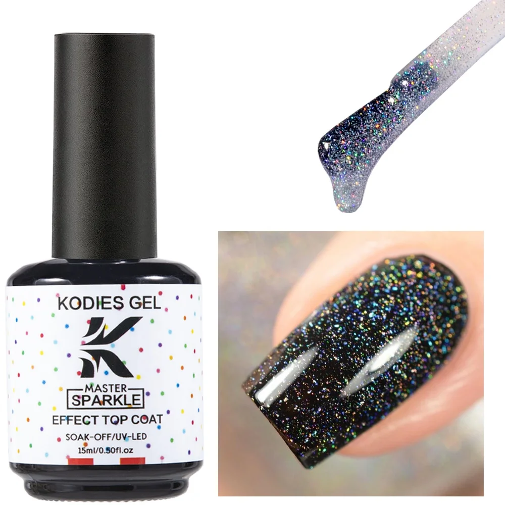 Compatible with All Brands Gel Nail Polish& Poly Nail Gel- KODIES GEL Super Holographic glitter gel top coat is suitable for dip powder nails, artificial nails, acrylic nails, soak off gel nail tips etc, gives a glitter shine on your gel nails of any base colors you apply.