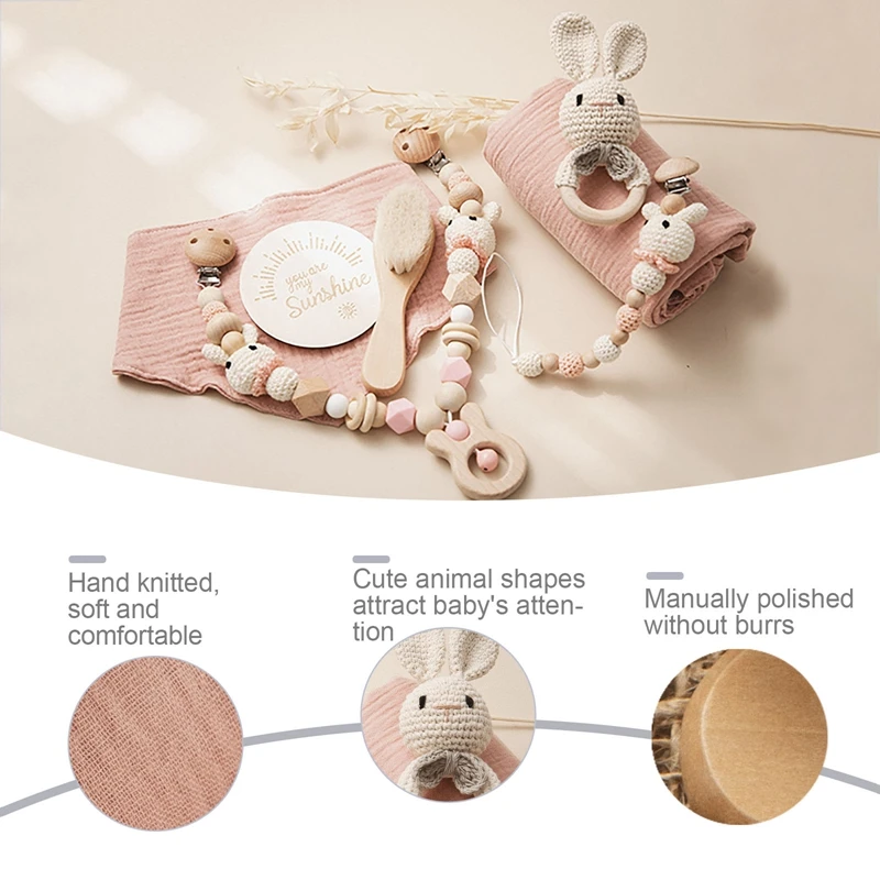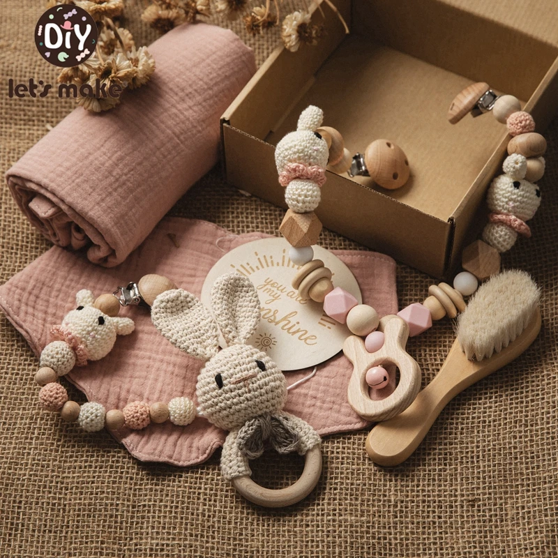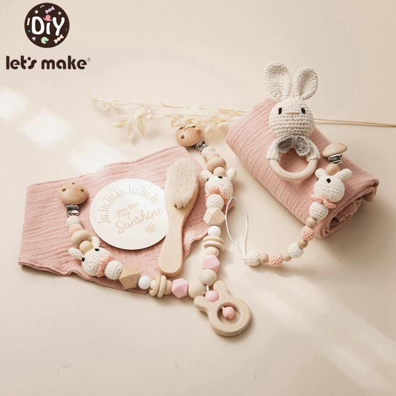 Let's Make 7Pcs Newborn Birth Gift Baby Toys Rattle Bath Brush Baby Teether Bracelet Bibs Milestones Cards Photography Props Set