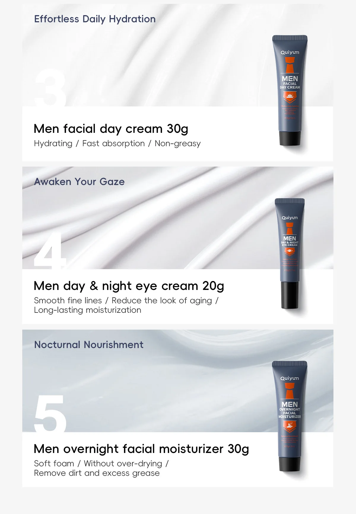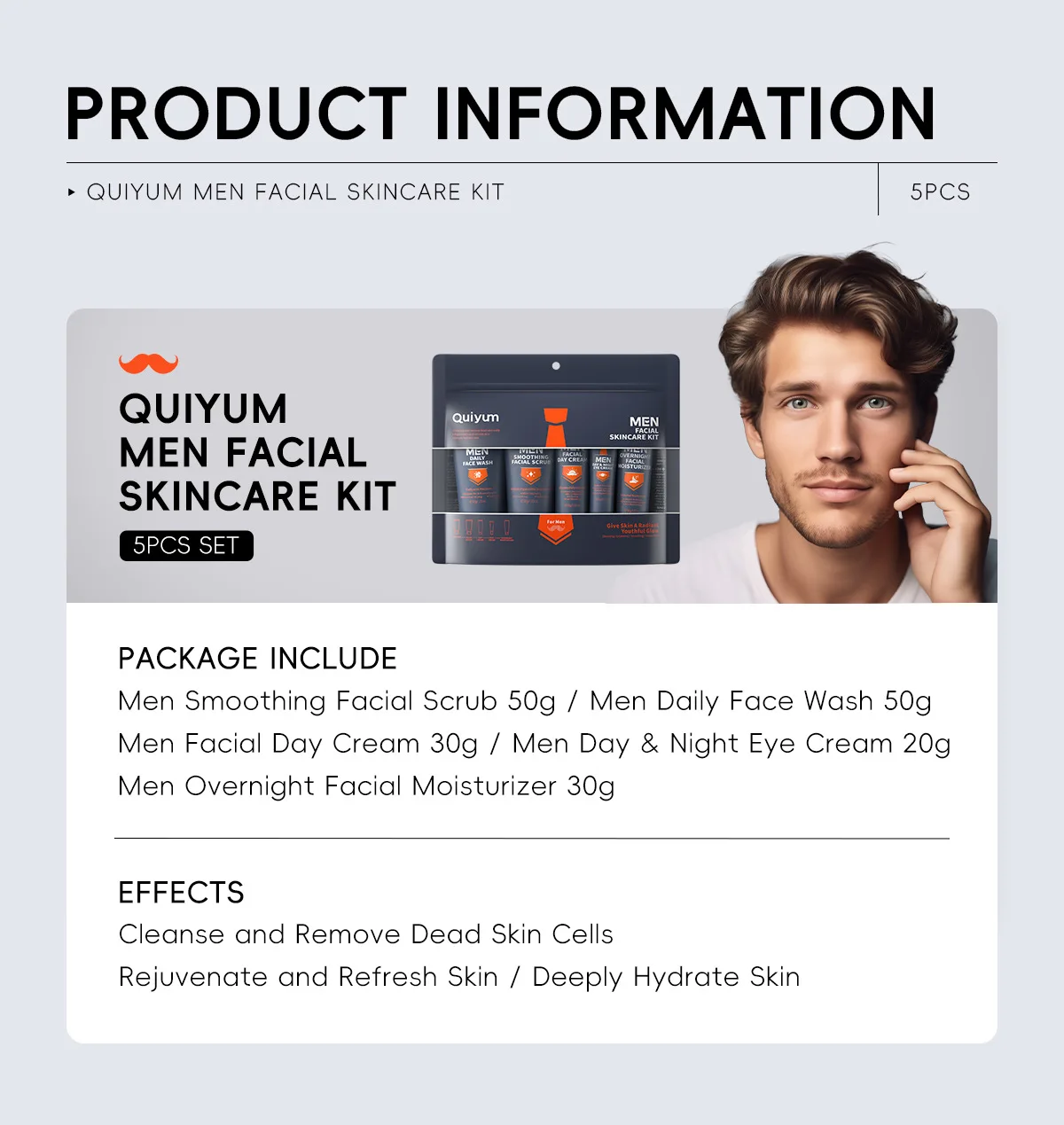 QUIYUM Men Facial Skincare Kit 5pcs Set Facial Scrub 50g Face Wash 50g Day Cream 30g Eye Cream 20g Overnight Facial Moisturizer 30g